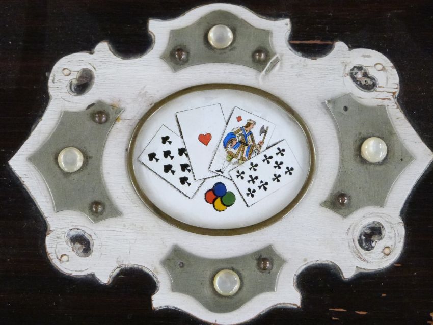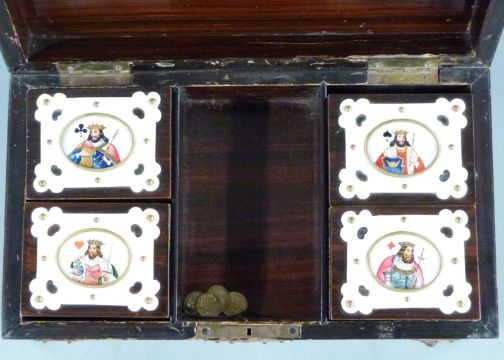 Metal and faux ivory bound playing card box with central panel depicting playing cards, opening to reveal four lidded boxes each painted with different suits, each containing stained wooden gaming counters, width of box 26cm