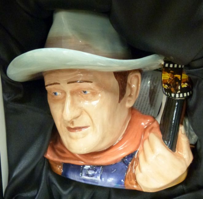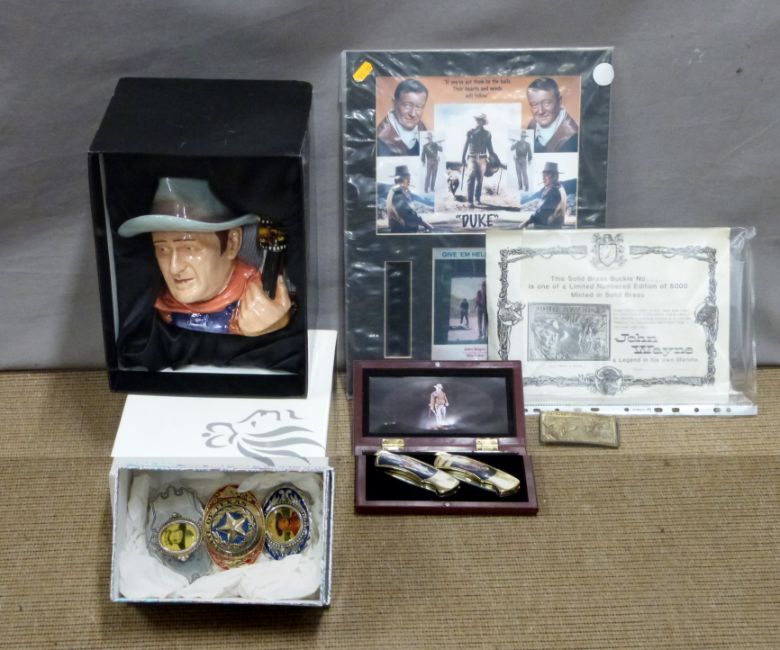 Royal Doulton John Wayne character jug, related pocket knives, film cell, belt buckles etc