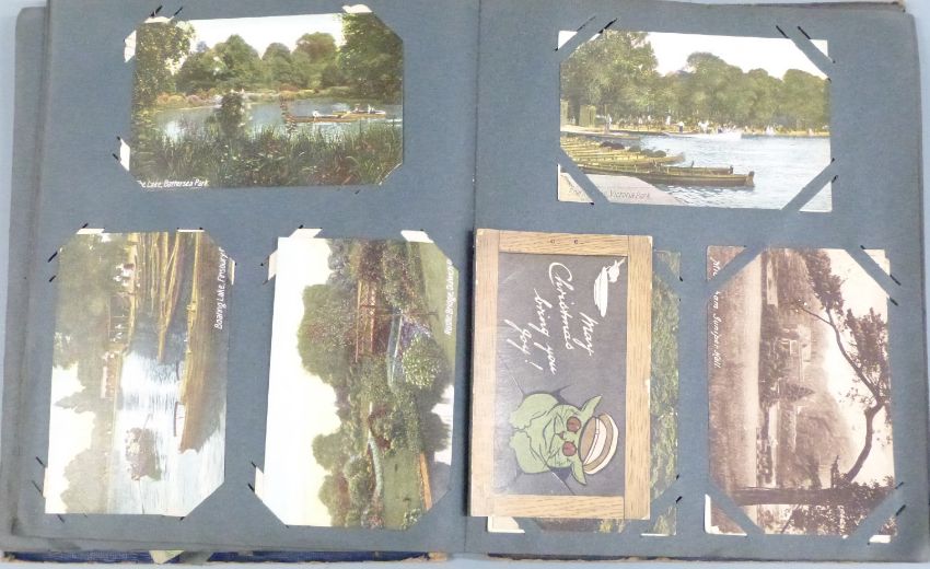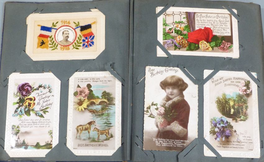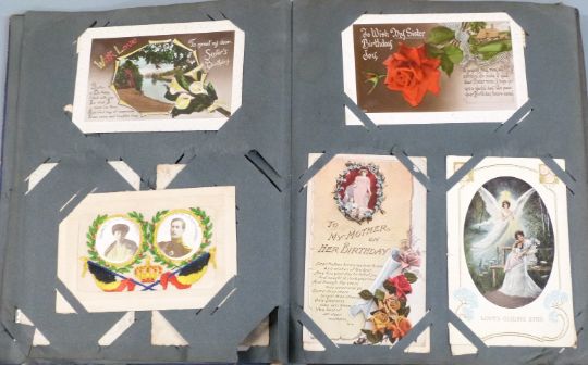 Edwardian and onwards postcard album containing approximately 180 postcards to include WWI, hand-painted, McGill and other humourous, early greetings examples, Zeppelin etc