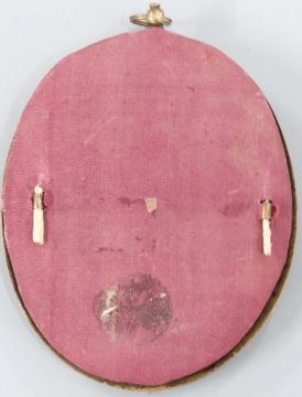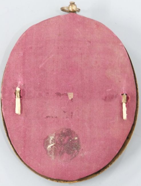 19thC portrait miniature on copper of a lady with feathered hat and lace trimmed dress, maximum diameter 72mm, in engraved brass frame with suspension loop