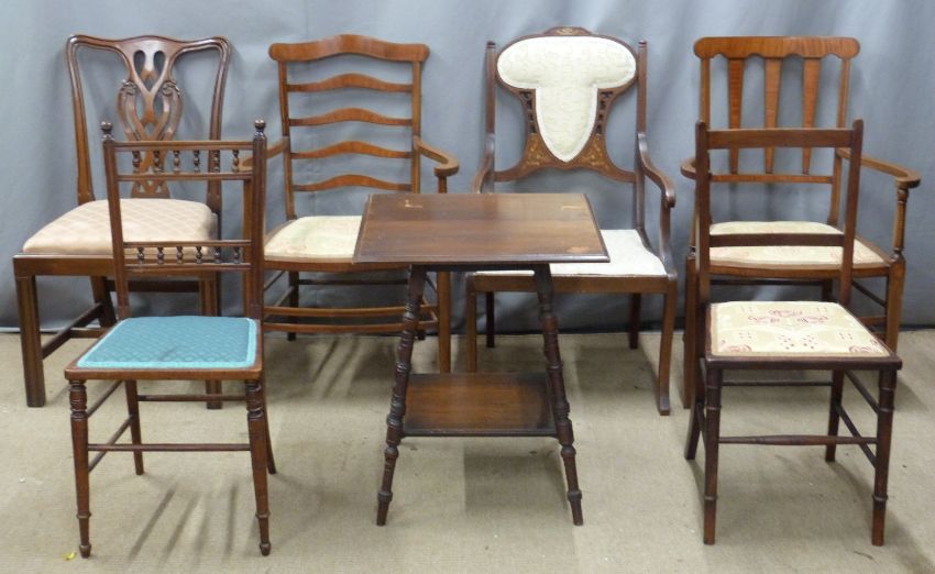 A mahogany side table with undershelf and six chairs including inlaid examples