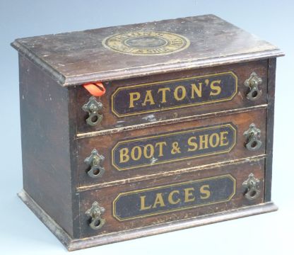 Shopfitting/ haberdashery advertising chest of three drawers with Dales' Gold Medal Dubbin and Paton's boot and shoe laces adverts, W37 x D24 x H27cm