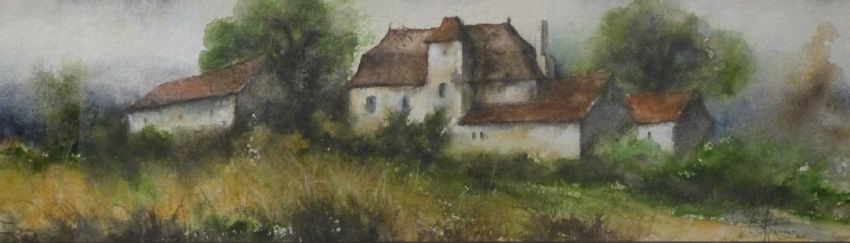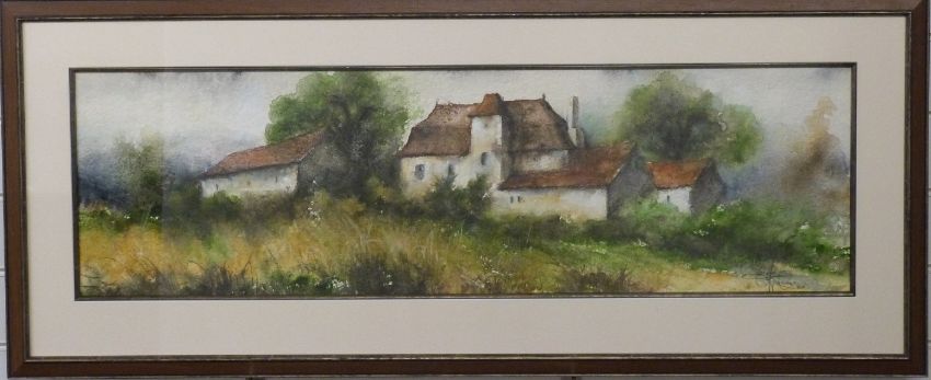 20thC French watercolour, monogramed lower right and verso, 'Le Grande Demeuse Lotoise', 28 x 97cm, framed and glazed.