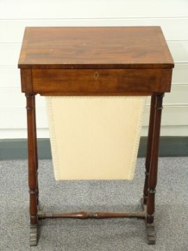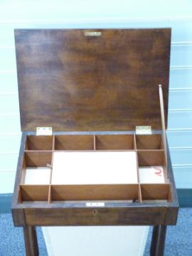 Victorian mahogany work table with crossbanded detail, fitted interior and upholstered drawer, raised on turned legs, W49 x D34 x H75cm