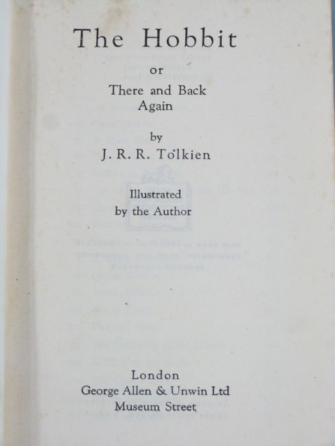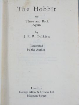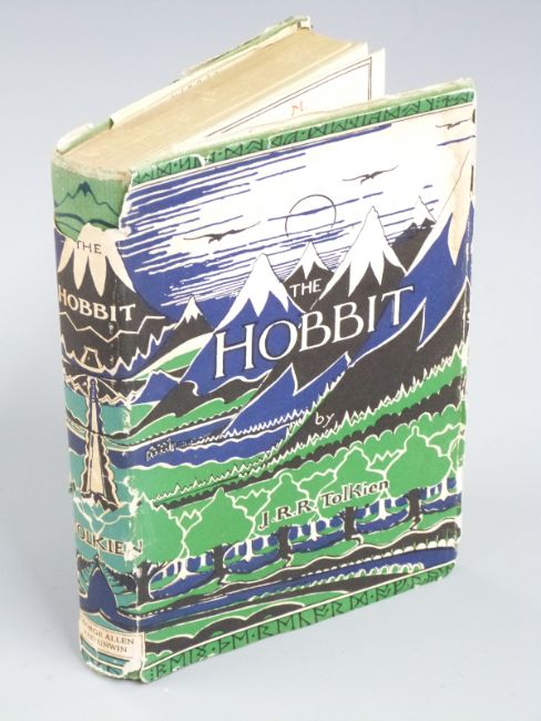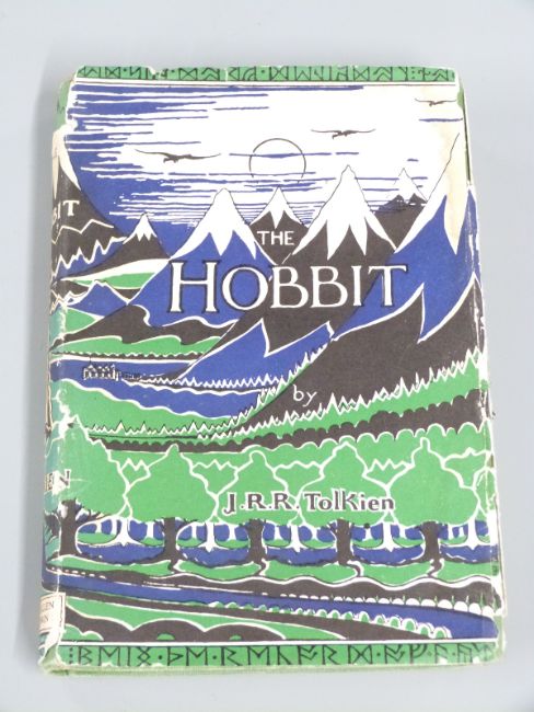 J.R.R. Tolkien The Hobbit or There and Back Again Illustrated by The Author published George Allen & Unwin 1946 fourth impression with coloured frontispiece and lack and white text illustrations, maps printed on endpapers in original publisher's cloth with lettering and decoration and in a colour dust-wrapper from later edition (small circular ink number stamped on rear endpaper)