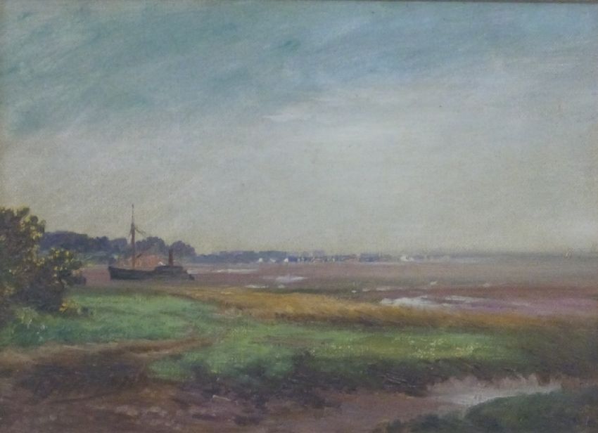 John Shapland (1865-1929) oil on canvas of beached steam ship in estuary, possibly Woodbury on the Exe, Devon, signed lower left, 20 x 27cm, framed and glazed