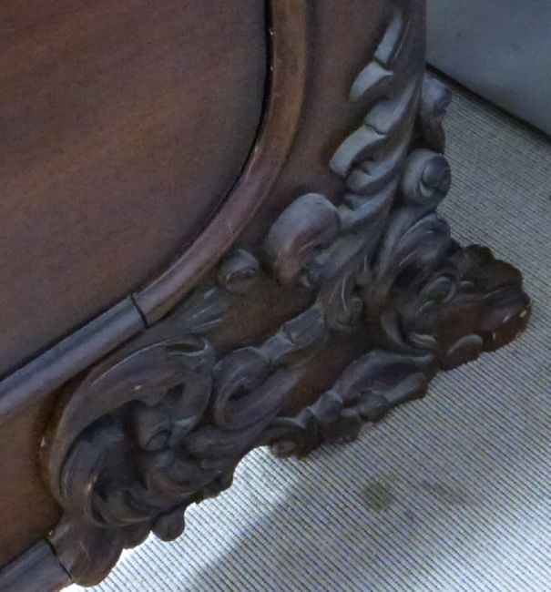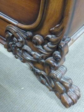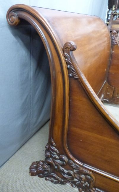 A 19th/20thC mahogany sleigh bed raised on ornate carved pad feet, W164 x D137 x H297cm