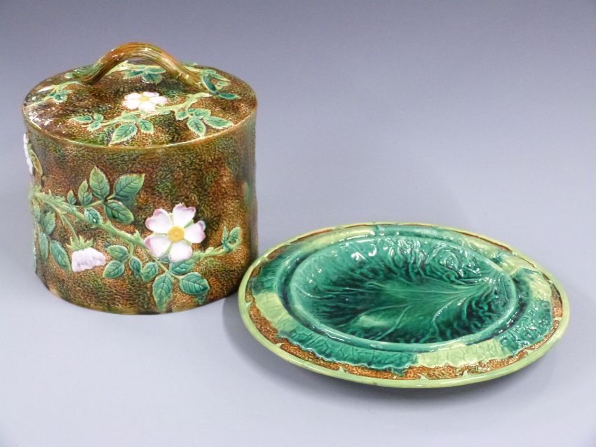 George Jones & Son 19thC  majolica cheese dome and underplate decorated in relief with dog rose against a brown ground, H28cm D32cm