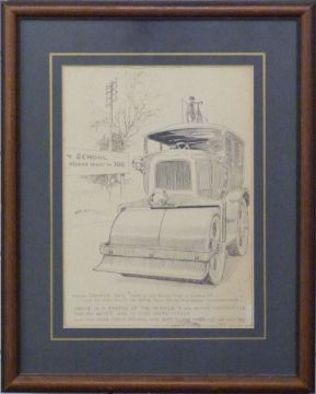 Frank Patterson (English 1871-1952): Pen and ink drawing of road roller with cycle on top and humorous caption 'School reduce speed to 100', initialled and dated 1927 lower right, 25 x 18cm