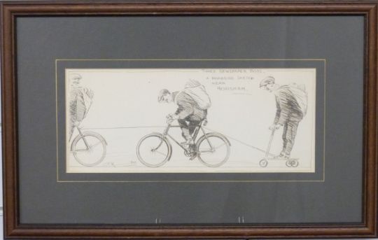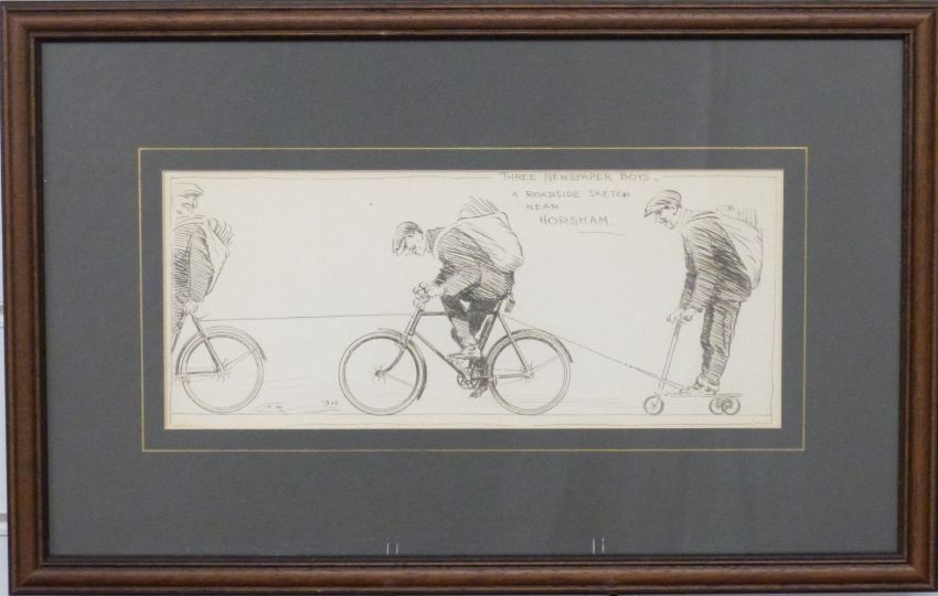 Frank Patterson (English 1871-1952): Cycling related pen and ink drawing 'Three Newspaper Boys, near Horsham', signed and dated 1923 lower left, 11 x 28cm
