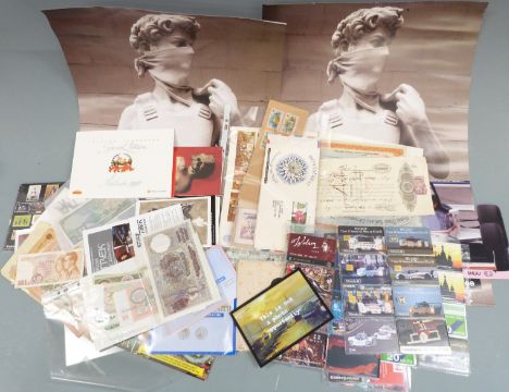 Banksy v Bristol Museum 2009 advertising poster, silk escape map of Italy, Swiss frontier, Sicily etc, postcards including twelve sealed Banksy, a few mint stamps, covers, banknotes, share certificates, unused phone cards including Arsenal v Tottenham, Star Trek, Mercury cards, motor racing related, pop and rock, Walt Disney Mickey Mouse silver coin, 1999 Grand Prix, Macau phonecard set etc