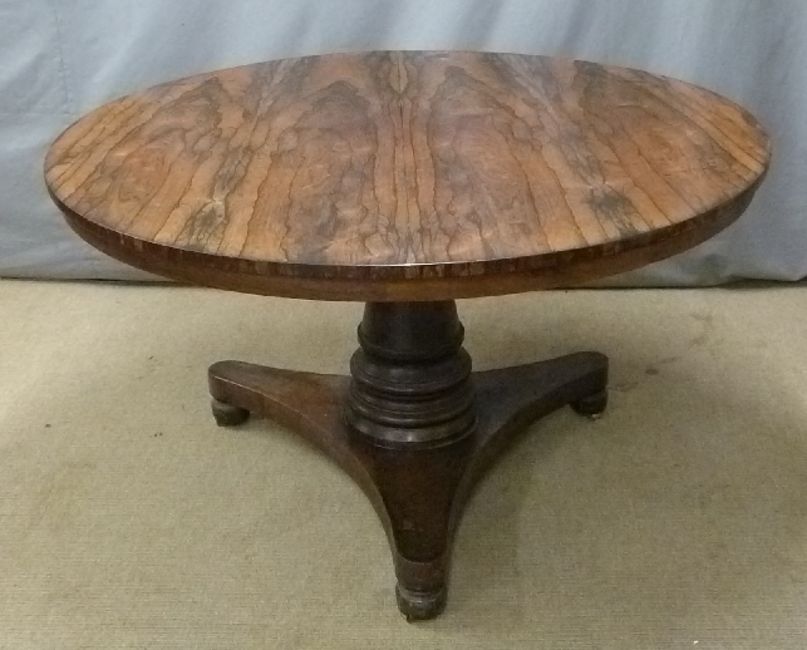 Victorian rosewood circular breakfast/ tilt top table raised on a stepped form support, tripod base and brass castors, Diameter 130 x H73cm