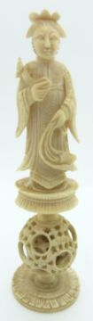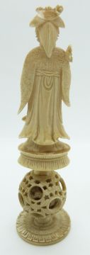 A 19thC carved Chinese ivory chess piece with puzzle ball, 13.5cm
