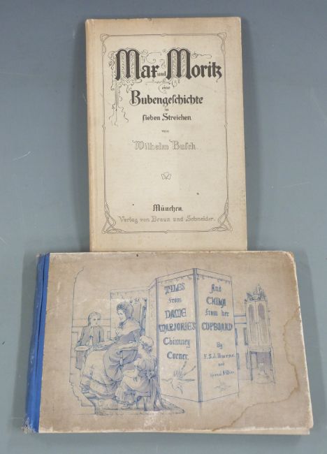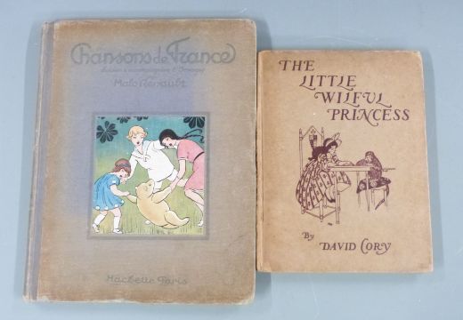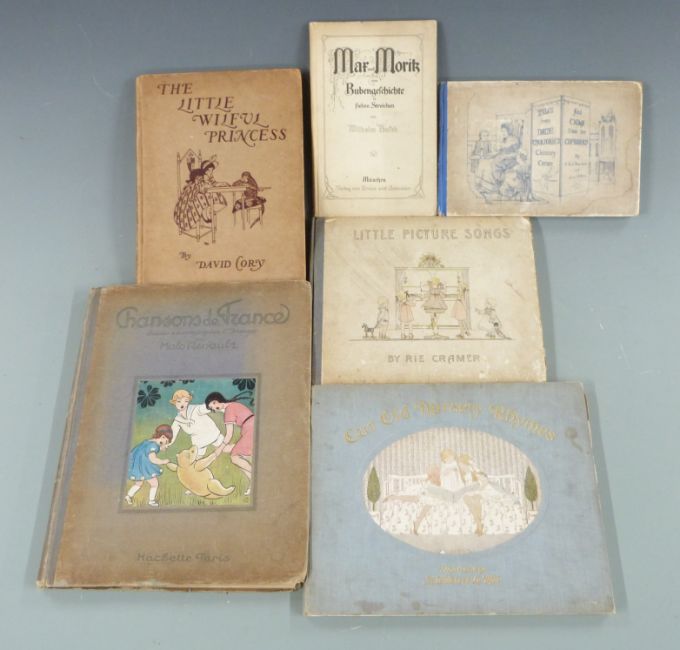 Little Picture Songs by Rie Cramer in cloth backed pictorial boards, Our Old Nursery Rhymes illustrated by H. Willebeek Le Mair 1911 gilt cloth with colour plate, Chansons de France illustrated in colour by Malo Renault 1923 illustrated boards, The Little Wilful Princess 1918, Tales from Dame Marjories Chimney Corner decorated boards & Wilhelm Busch (6)