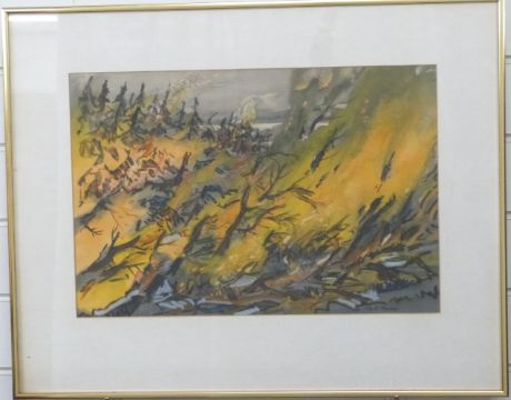 G.C. Potts (British) gouache of forest fire, signed lower right, 32 x 46cm, framed and glazed