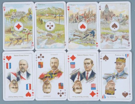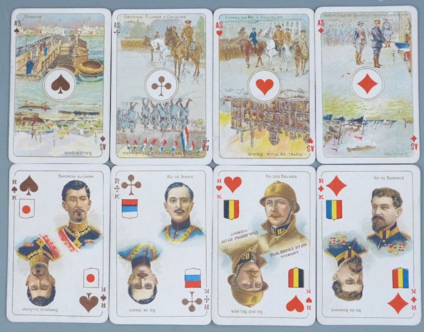 Two packs of WWI interest playing cards, one pack with various leaders and battles, the other similar but includes Japan, Serbia etc