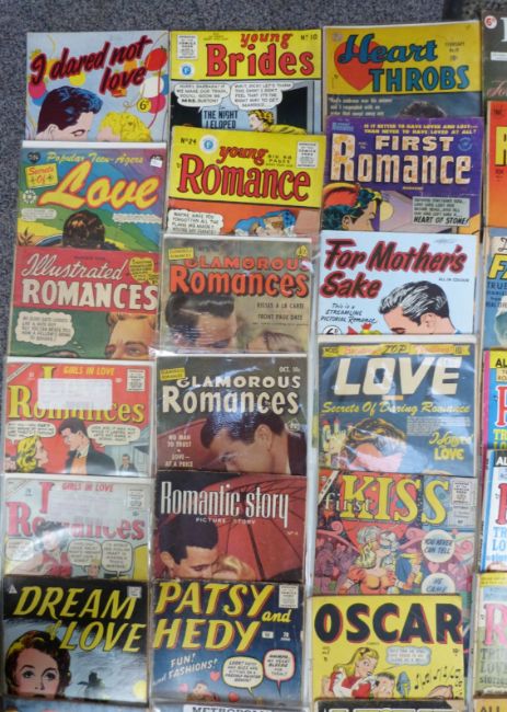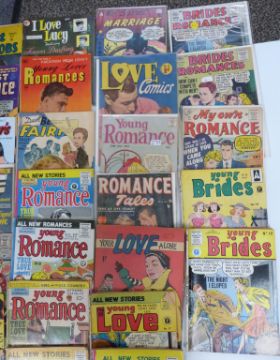 Fifty vintage love and romance comics including Young Brides, True Secrets, My Own Romance, Brides Romances, Falling In Love, My Secret Marriage, Your Love Alone, Long Love, Love Comics, Young Lover Romance, Romance Tales, I Love Lucy, Young Romance, Born Again, Oscar, Live It Up, Born Again etc.