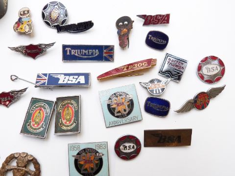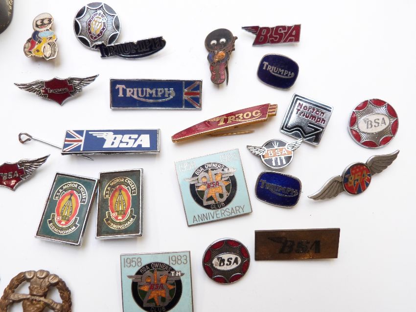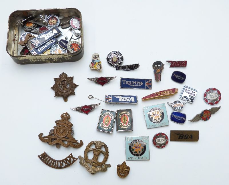 Quantity of military and motorcycling badges including silver BSA, Triumph, Norton, Middlesex, hallmarked silver ARP and RASC