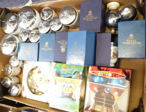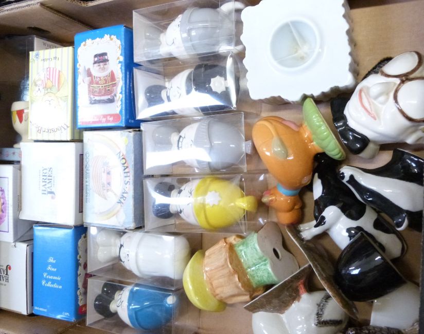 Approximately 50 novelty egg cups and coddlers including large size Royal Worcester, boxed Worcester, Wedgwood, Beatrix Potter, boxed Spode, Harry James, Doctor Who, advertising etc