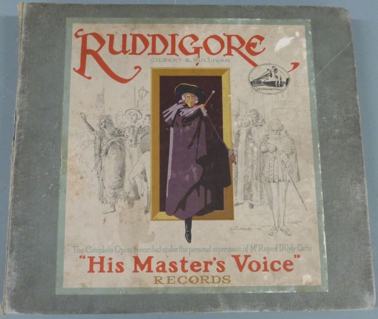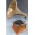 Horn gramophone with brass horn and Gilbert and Sullivan 78rpm records in a folder