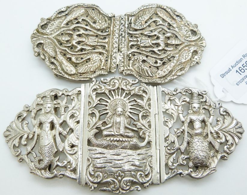 Two white metal buckles in the form of deities