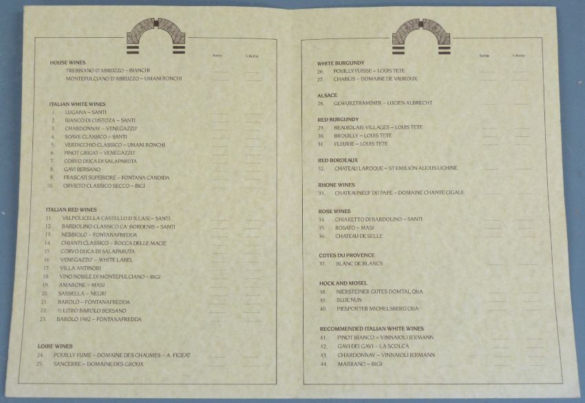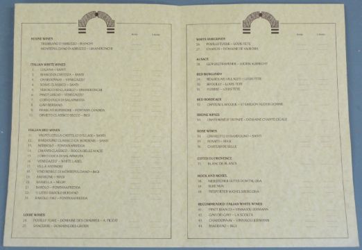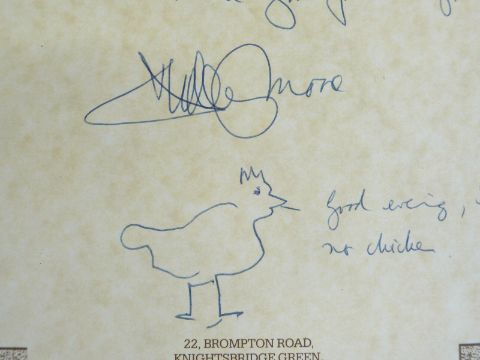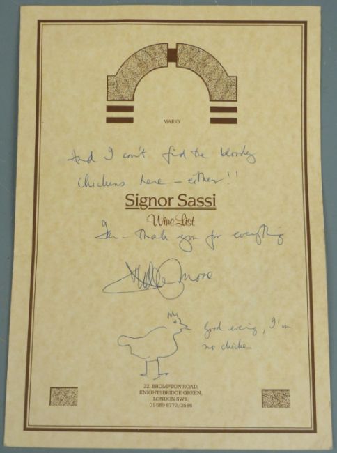 Dudley Moore autographed wine list with amusing anecdote and drawing of a chicken, 30 x 21cm