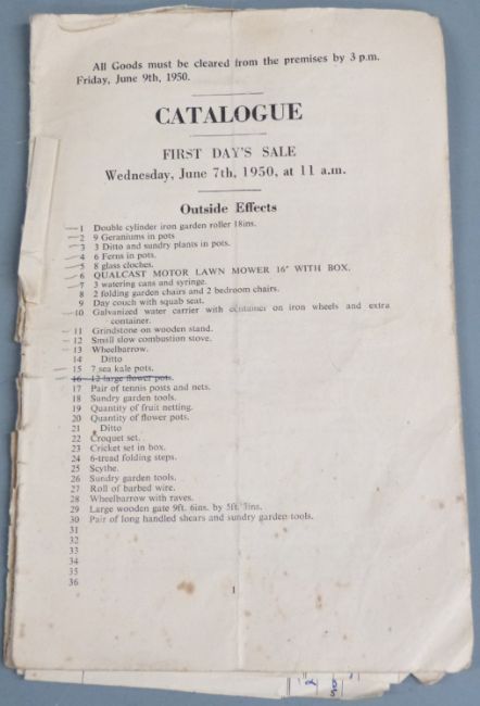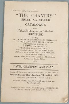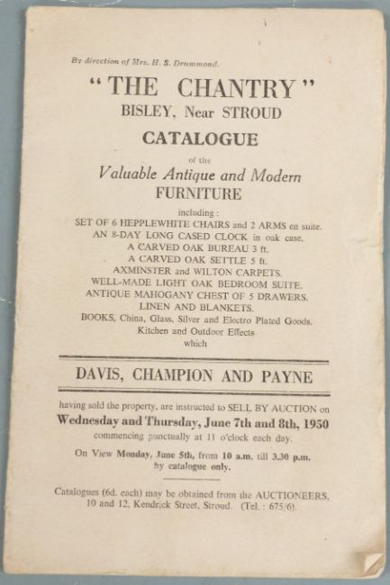 Key and auction catalogue for 'The Chantry', Bisley, near Stroud, 1950 by Davis, Champion and Payne, comprising two sets of particulars for the house and two for the contents together with various buyer's invoices.  Please note the previous lot, 601 also from The Chantry.