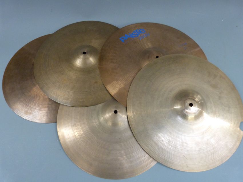 Five cymbals including Paiste 2000 16" crash, Paiste 2002 hi-hat etc