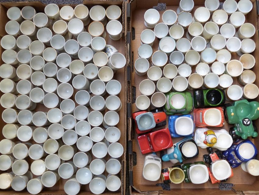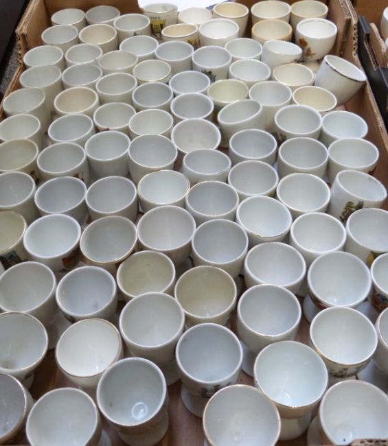 Approximately 140 novelty egg cups, mainly crested, and a small quantity of transport related