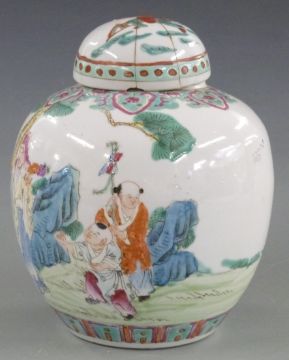 A 19thC Chinese ginger jar decorated with figural scene, with mark to base together with a similar ginger jar with prunus decoration, 20cm tall