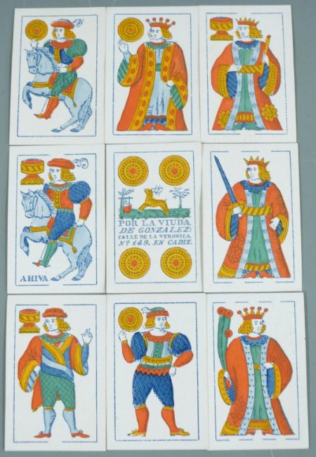 Pack of 19th century Spanish playing cards, marked to the four of coins Por La Viuda De Gonzalez No. 149 En Cadiz and dated to the five of swords 1854