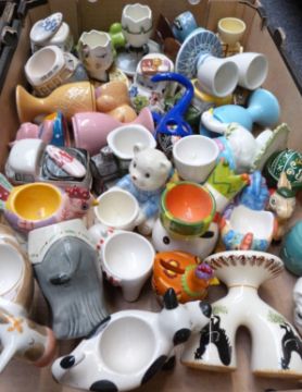 Approximately 100 mostly ceramic egg cups including VW Camper, animals, Devon pottery, Honiton, Toby Wood etc