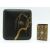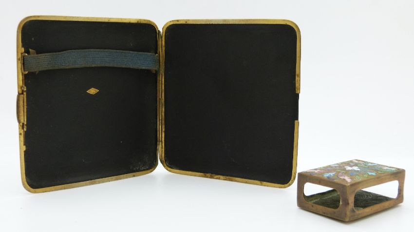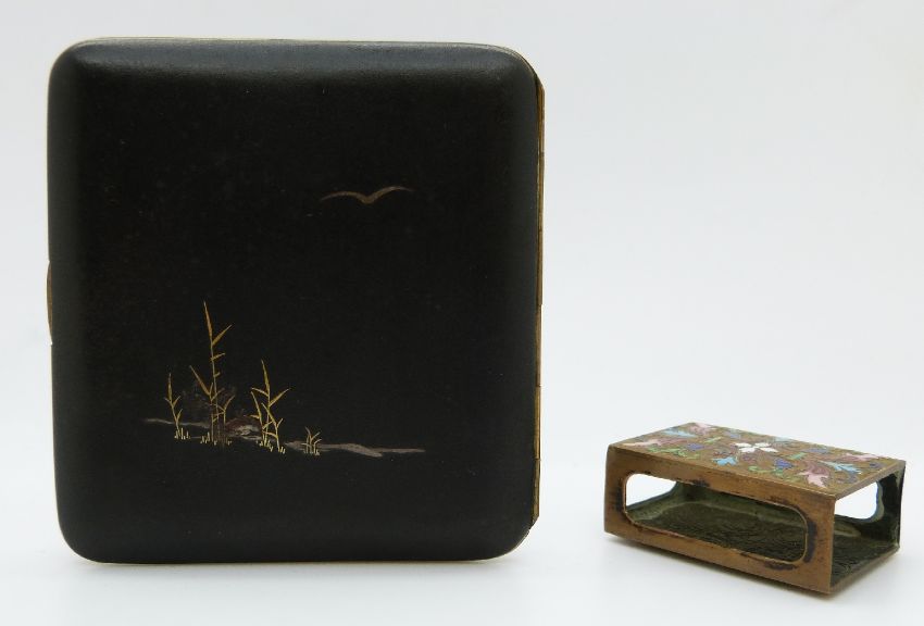 Japanese cigarette case with gilt decoration of an egret and an enamel matchbox holder