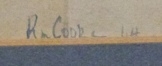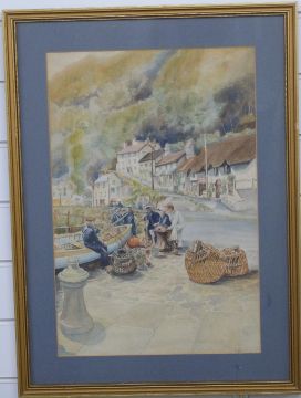 R. Cooke (20thC) watercolour Devon or Cornish scene, quayside with houses rising sharply on street beyond, signed lower right, 50 x 34cm, framed and glazed