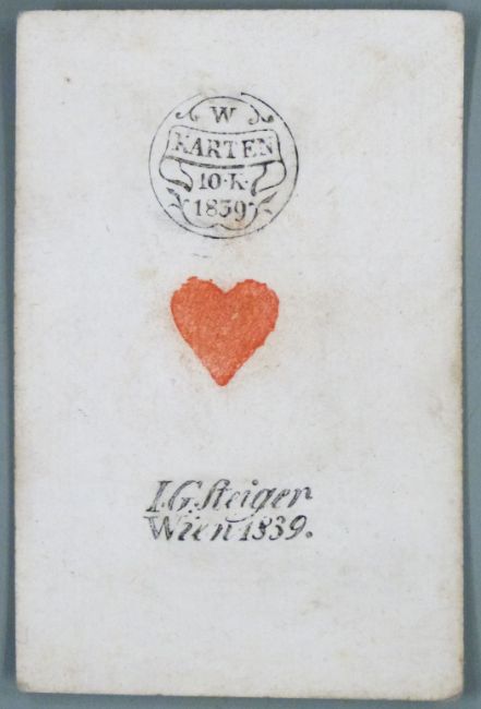 Steiger, Vienna pack of 19th century playing cards, marked to knave of diamonds Von Joh. Georg Steiger vormals Joh. Norbert Hofmann, Kaisl Konigl Landers Fabrikant in Wien in der untern Breuner Strasse No. 1132 and to ace of hearts IG. Steiger Wien 1839