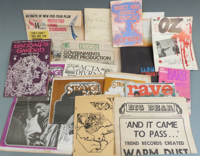 A collection of 1960's/70's pop counter culture magazines and literature including OZ no.10, Big Bear no.3, Strange Days, Soviet Weekly, Bach-us no.2, Acta Diurna, 1970 Edinburgh Fringe Festival 1970 brochure, Phallia, The Ugly Ducking Conservatory Government July 1914, Friends, Gandalf's Garden no.4, The Naked Barb 1970, Lunar Orbit folder etc. Some items signed by Peter Gabriel of Genesis and probably formerly his property