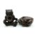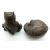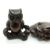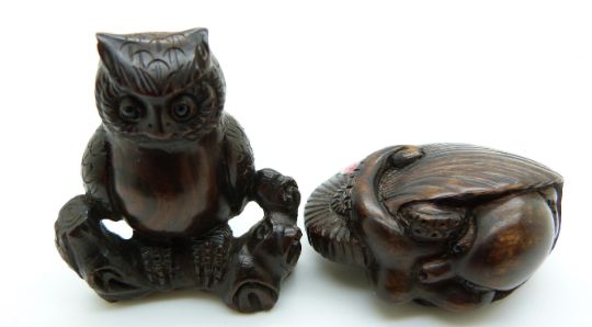 Japanese dark wood netsuke depicting a coiled octopus or squid, together with a vintage dark wood netsuke depicting an owl, both signed