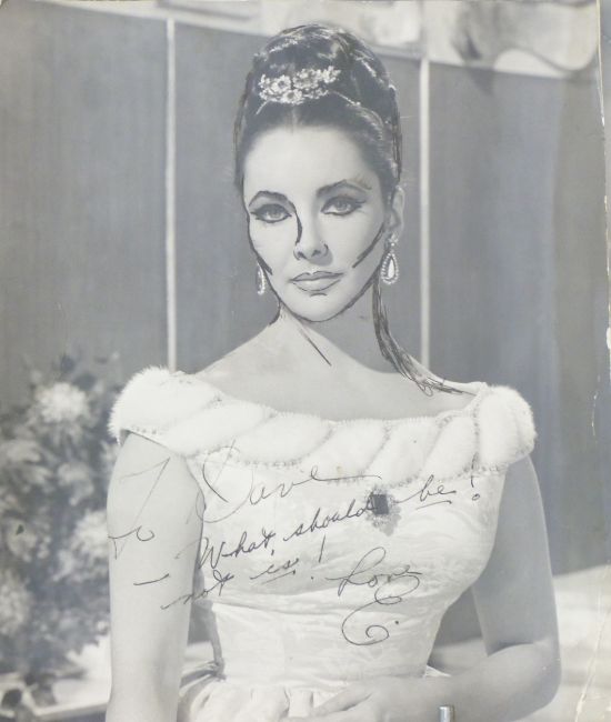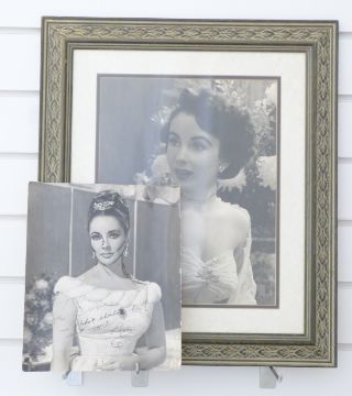 Signed autographed photograph of Elizabeth Taylor (29 x 24cm) with dedication to 'Dave' (David Aylott, make-up artist who worked with Taylor on 'Cleopatra' and 'VIPs'), together with a signed large format picture of Taylor (faded signature), 35 x 27cm