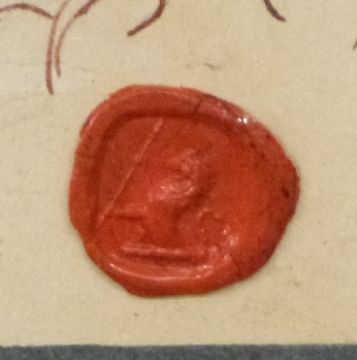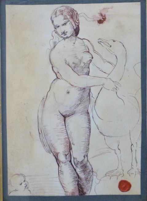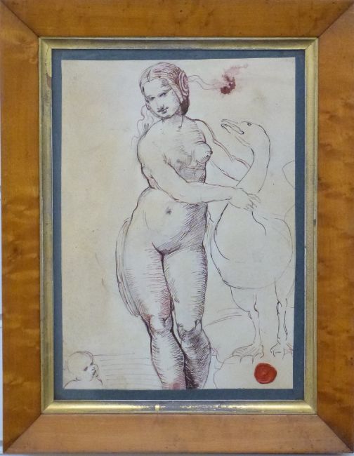 18th/19thC pen and ink drawing of lady, possibly Leda, with a swan and child with wax seal to bottom right, 26 x 18cm, in birdseye maple frame