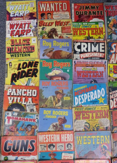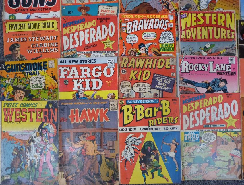 Sixty-five vintage cowboy and Western comics including Kid Cowboy, Billy The Kid, Rangers, John Wayne, Wild Boy, Thunda, B-Bar-B, Kid Colt, Rex Hart, Bronco Bill, Outlaws of the West etc