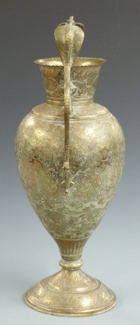 Cairo ware brass vase with engraved winged figures and serpent handles, 55cm tall