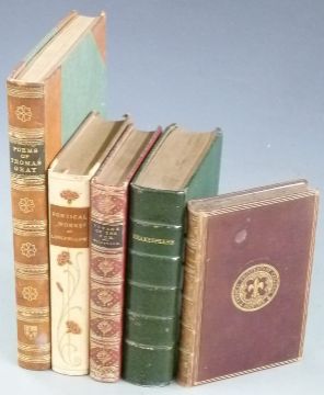Complete Works of Shakespeare in full morocco binding, Longfellow Poetical Works 1904 in cloth boards with a decorated colour floral vellum spine & leather label, A Voyage in The Sunbeam by Mrs. Brassey with illustrations 1882 in full gilt leather, Voyage of The Fox in the Arctic Seas 1875 and Poems of Thomas Gray 1907 (5)