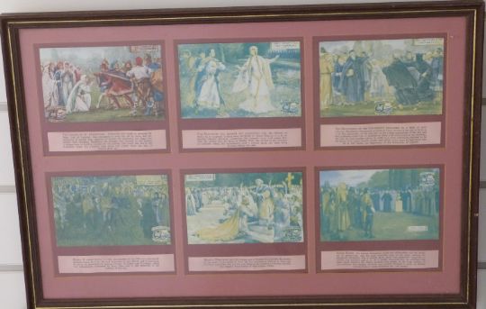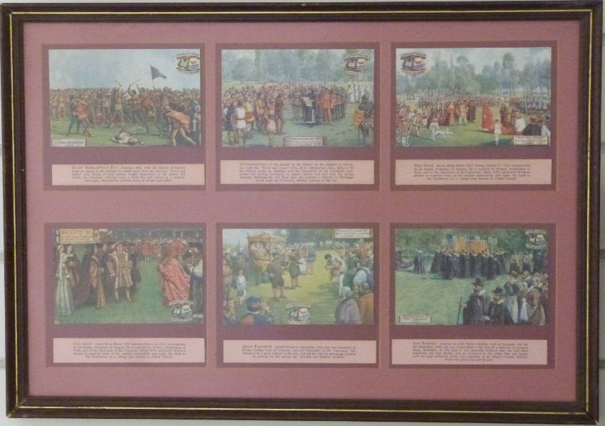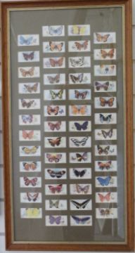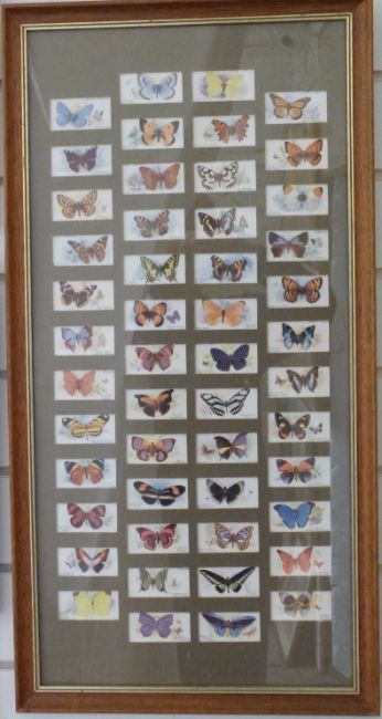 A framed set of John Player Butterflies 1932 cigarette cards and a set of 18 Oxford Pageant postcards in three frames