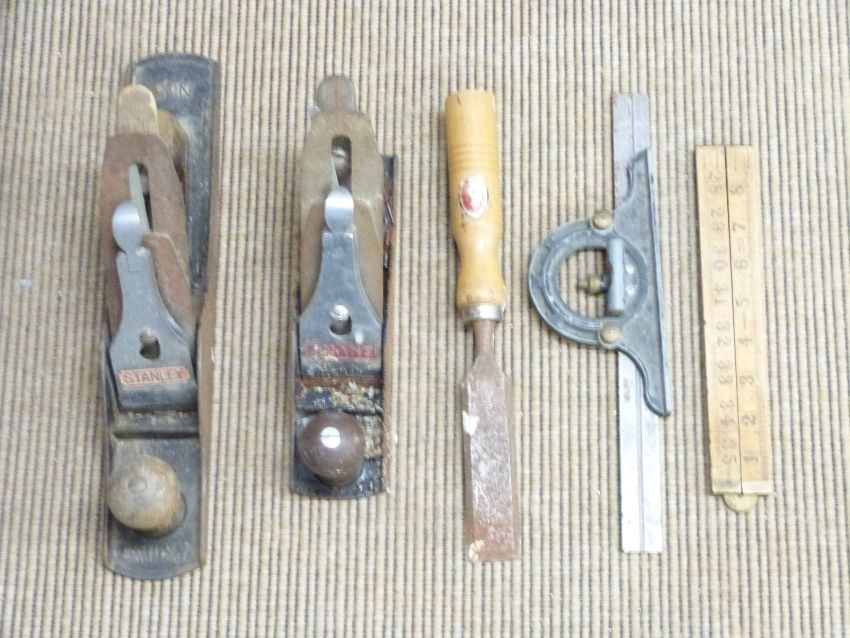A collection of woodworking tools including planes, chisels, folding rulers etc