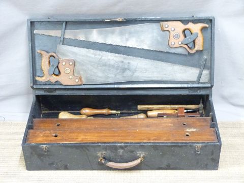 A vintage woodworking/carpenter's chest with fitted interior and a few tools including chisels, saws, scribe etc, 40x78cm