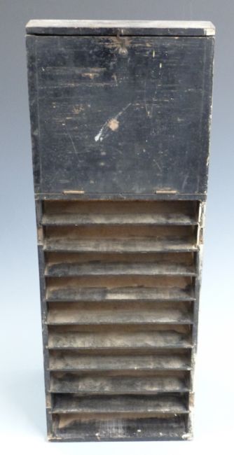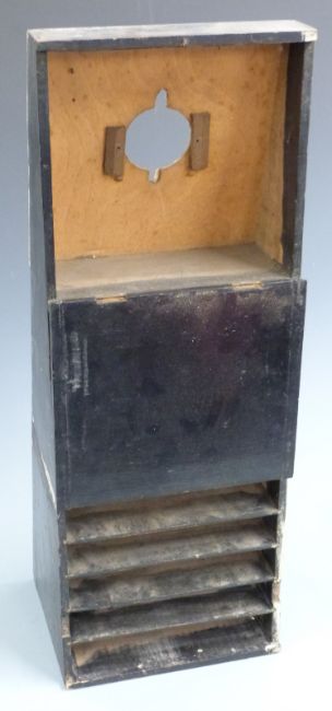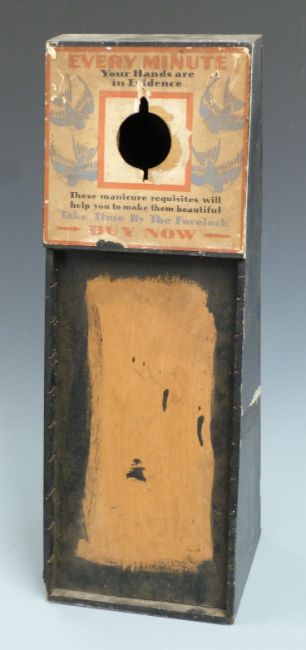 Shopfitting/haberdashery advertising counter top 'manicure requisites', display stand with shelves behind, height 61cm