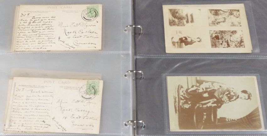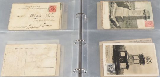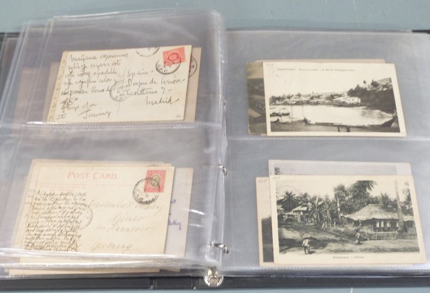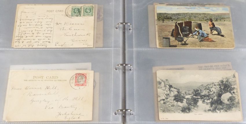 A mainly Edwardian postcard album comprising street scenes Ladysmith, President Kruger's funeral, Victoria Falls, Cecil Rhodes' grave, various South Africa views, native gathering, early Freetown, Sierra Leone and Lagos, Nigeria views, Boer war interest, early Japan and Canada cards, WWI silks and 1950's South West Africa cards, approximately 86 cards