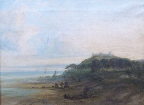 H Smyth 19thC oil on canvas Llanstephan (Llansteffan), South Wales, castle above shoreline with fishermen and boats, signed lower right and numbered 33, 46 x 61cm, in gilt frame
