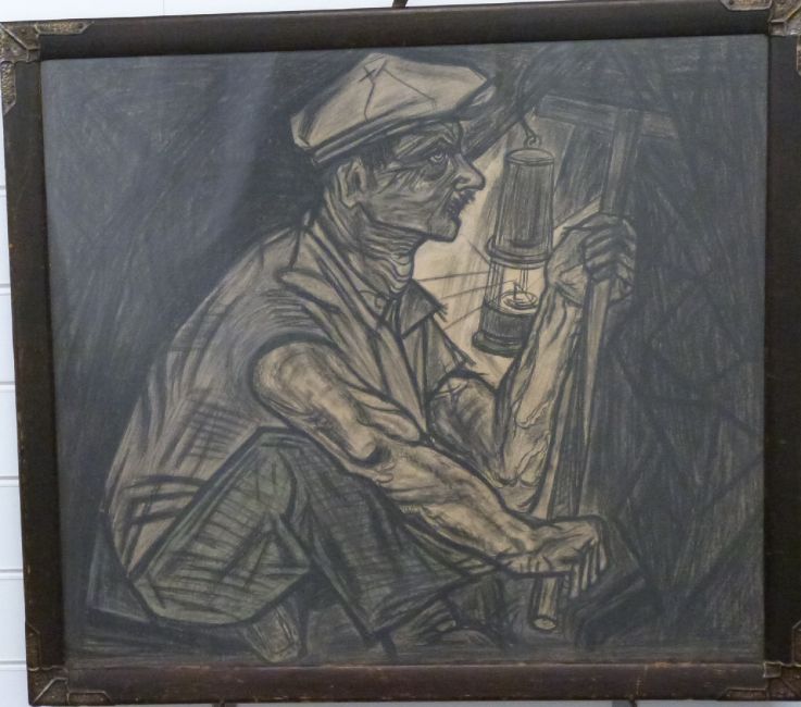 In manner of Kyffin Williams, charcoal drawing of miner at work, 62 x 70cm, framed and glazed