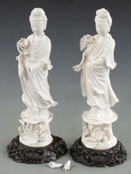 Two Chinese blanc de chine figures on carved hardwood bases, H43cm